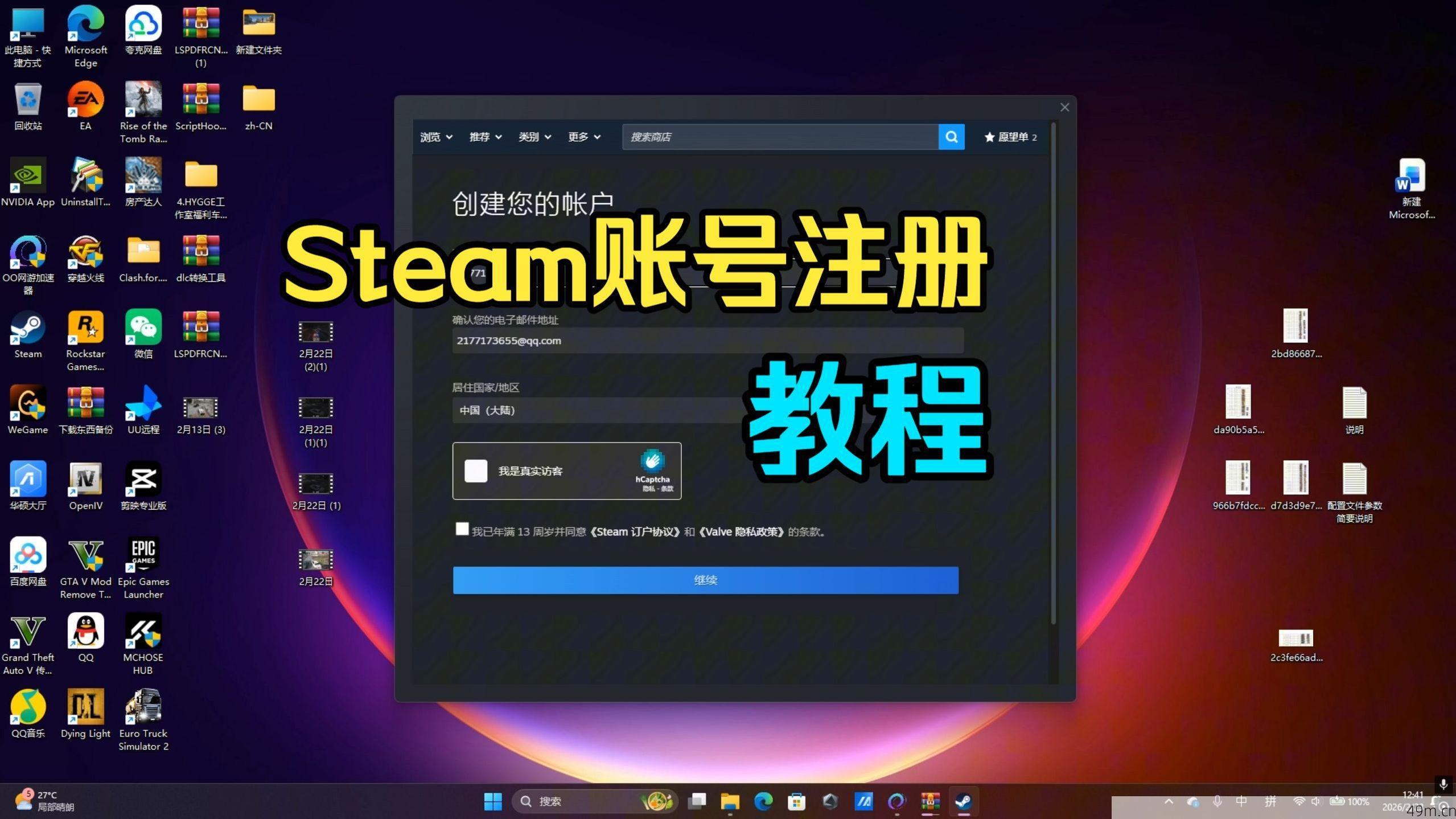 教学一下信用账号注册。前两项是电子邮箱,可以是QQ邮箱、163邮箱、谷歌邮箱等。选择自己常用且能正常登录的邮箱。地区。这里人机验证要等一下。要打开刚刚输入的邮箱里。我刚刚输入的是QQ邮箱,所以我打开QQ邮箱。找到使用发送的信息。对蓝色按钮。显示已验证就回到新软件里。创建账号名称和密码。按照给的提示进行操作。创建成功了。输入刚刚创建的账号密码。这里又要回到刚刚绑定的邮箱里。找到孙用发来的信息。输入这个验证码到使用软件里。等待进入即可。这里进去成功了,徐云账号就注册成功了。